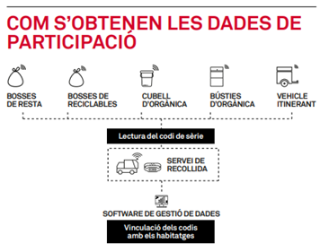 La recollida de les fraccions rebuig i reciclables es realitza en bosses homologades (de 35 i 60 litres, respectivament), la fracció paper-cartró es lliura en una caixa de cartró o a granel plegat i lligat i la FORM amb bossa compostable i en un cubell de 20 litres amb tag RFID que identifica l’habitatge. En el cas de les finques plurifamiliars, el lliurament de les fraccions resta, reciclables, paper-cartró i orgànica es realitza amb un bujol comunitari amb tag RFID.