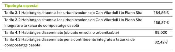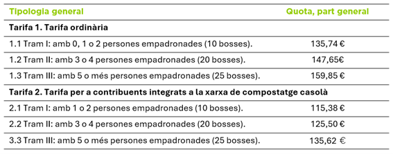 Tarifes de tipologia general per al servei de recepció obligatòria de recollida, transport, tractament i eliminació de residus domèstics, 2025.