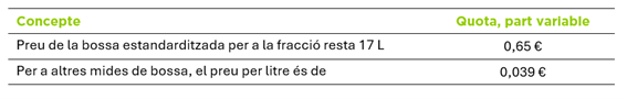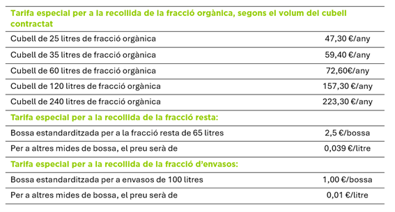 D’altra banda, a nivell comercial també hi ha una part variable que depèn del volum de cubell contractat per a la fracció orgànica (FORM). Aquest import es paga dins del rebut anual.